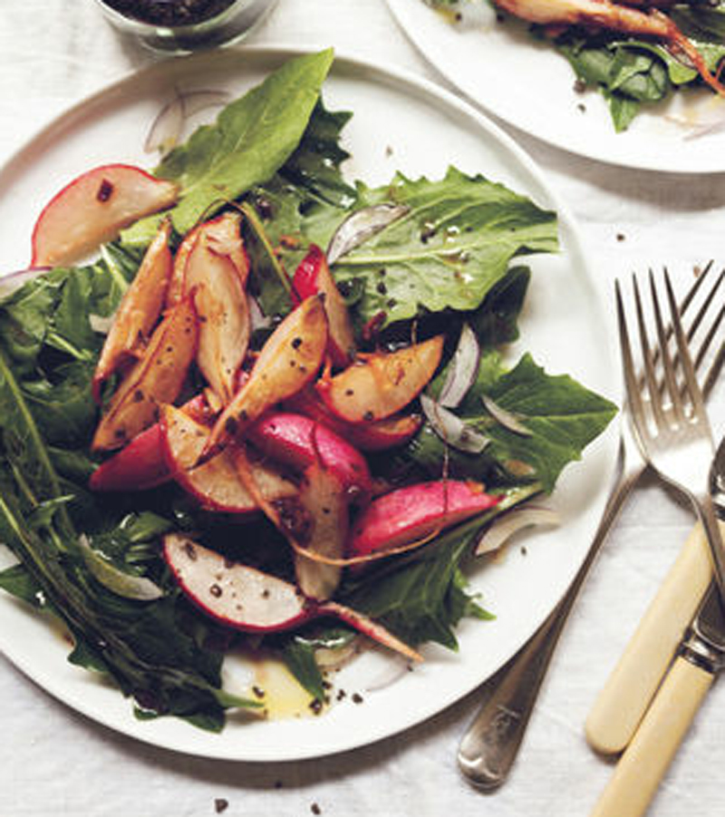 - To serve, make a bed of dandelion greens on each plate, arrange a portion of the radish halves on top, and pour the pan drippings over the top to dress the salad. Season with smoked sea salt, and enjoy.