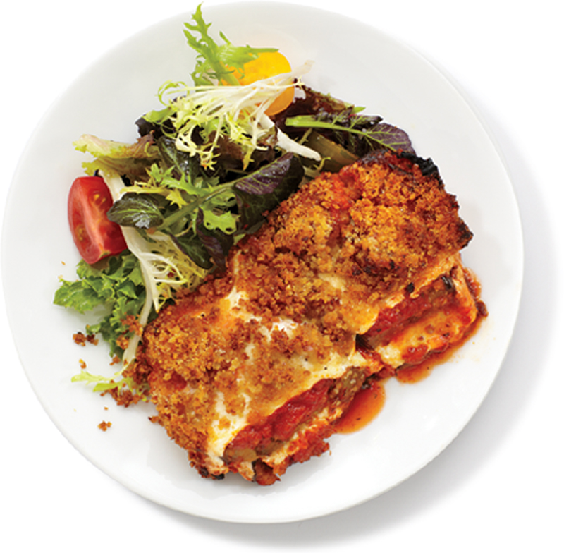 - Layer the eggplant, marinara, mozzarella, and Parmesan in an 8-inch baking dish; top with the panko. Bake until the cheese is melted, 30 to 35 minutes. Serve with the greens and tomatoes drizzled with the vinaigrette.