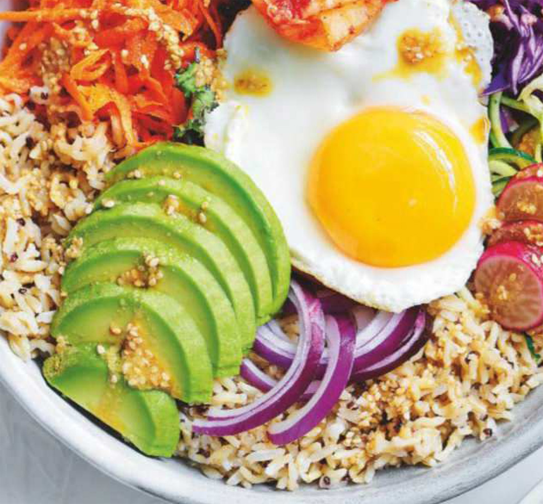 - Divide the rice mix between the bowls, then add all the prepared vegetables and kimchi or sauerkraut between the bowls, arranging them separately around the sides. Top with the eggs, drizzle over the dressing and serve immediately.