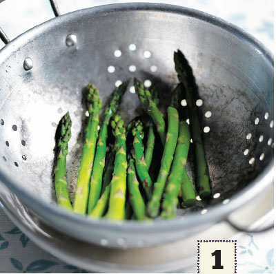 Steam the asparagus spears for 5 minutes, or until just tender. Drain and set aside.