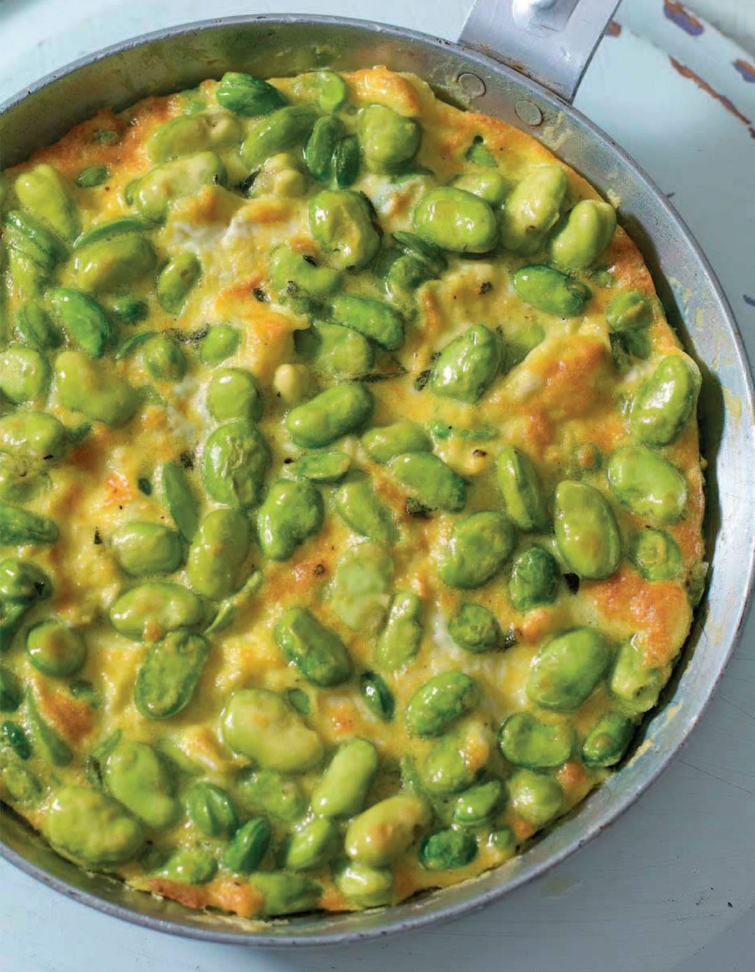 This tortilla is made with fava beans instead of potatoes and is flavored with marjoram, an herb that works well with all members of the bean family.