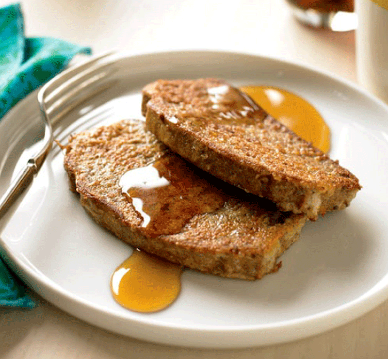 Slice the bread ½ to ¾” thick. You will find that the end result is a bit heavier than traditional French toast made from wheat-based bread, as with many wheat-free dishes, but this variation is wonderfully simple and pleasurable with none of the unhealthy consequences of the “real” thing. Serve with unsweetened Greek yogurt or whipped cream and blueberries, raspberries, or strawberries; fruit butters such as apricot or pumpkin butters; or sugar-free maple syrup, preferably sucralose-based and not sorbitol-based to avoid the blood sugar–increasing effects of sorbitol, not to mention the awful gas and cramps typically caused by some sugar alcohols.