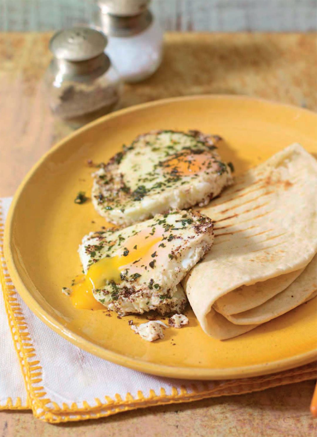 - Sprinkle a little salt over the eggs, divide into four portions, and serve with toast or flatbread.