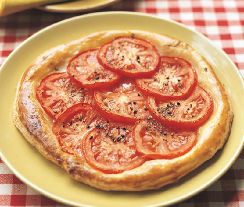 - Make an egg wash by whisking the egg yolks, corn oil, and 2 teaspoons water together in a small bowl. Brush the egg wash lightly over the pastry. Leaving a ½-inch border around the edge, arrange the tomato slices in overlapping circles on the pastry rounds, covering the surface and tucking a slice in the center.