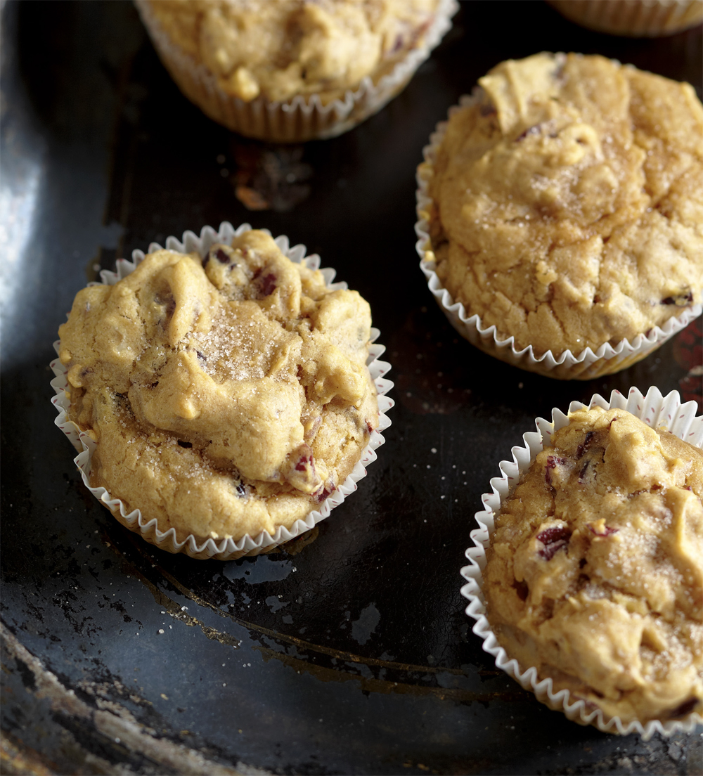 - Preheat oven to 350°F. Line 24 muffin pan cups with crinkly foil or paper liners and set aside. Place 1⁄4 cup flour, dried cranberries, and walnuts in a small bowl and toss well to dredge. Set aside.