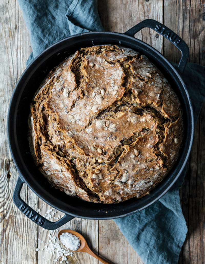 - Cover with the lid and either place 5–6 glowing briquettes on the lid, or close the lid of the barbecue. Bake for 45 minutes. Take the lid off the Dutch oven and leave for another 15 minutes to form a crispy crust.