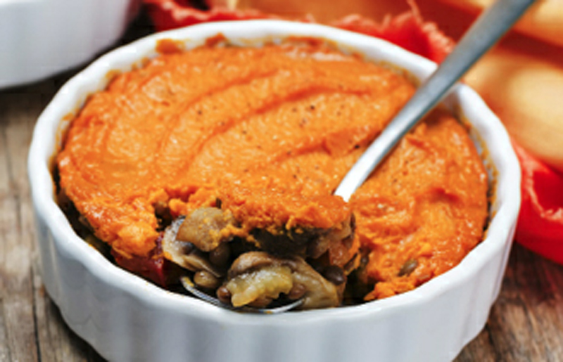- Now transfer the lentil mixture to a oven proof dish and top with the mashed sweet potato. Sprinkle with cheese and cook in the oven for approximately 20 mins. Serve immediately.