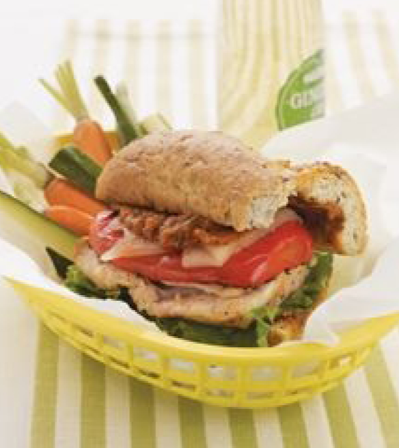 Work quickly when you assemble this sandwich so the chicken and bell pepper retain enough heat from the grilling to melt the cheese. Serve with raw cucumber and carrot sticks for a crunchy side.