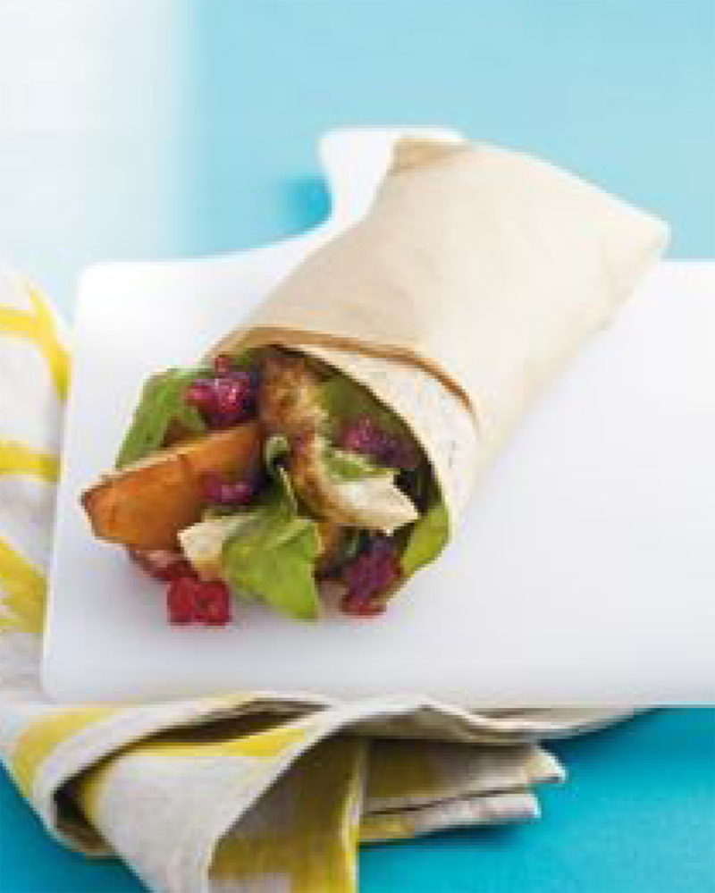 - Combine arugula and Cranberry Vinaigrette in a large bowl; toss well. Place about 1 cup arugula mixture on each tortilla; top evenly with chicken and pear slices. Roll up tortillas, and wrap in parchment paper. Cut each wrap in half.