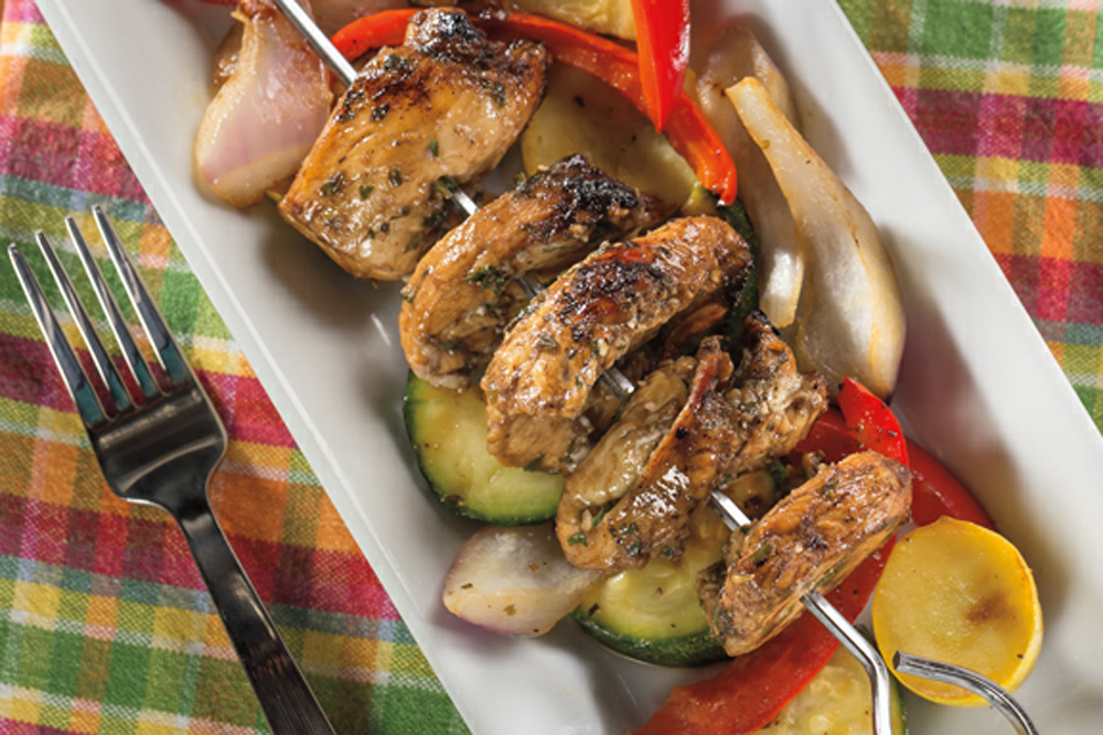 - Preheat grill to medium-high heat. Remove chicken from bag and thread pieces onto six metal skewers. Discard remaining marinade.