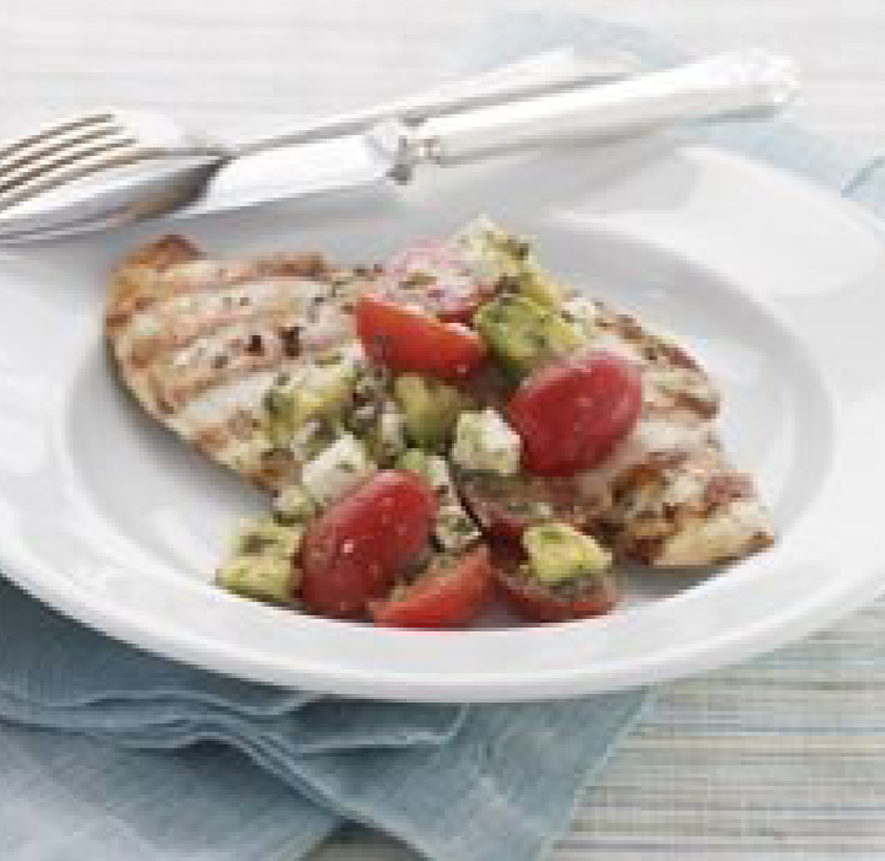 - Remove chicken from marinade, discarding marinade. Place chicken on a grill rack coated with cooking spray. Grill 3 minutes on each side or until done. Chunky Tomato-Avocado Salsa