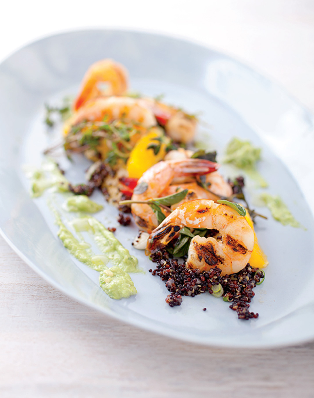 - Halve the avocado, remove the pit, and cut into medium dice. Transfer to a serving bowl. In a small bowl, combine the olive oil, reserved orange juice, orange segments, lemon juice, and salt and black pepper. Pour over the avocado. Add the warm quinoa and gently toss. Add the mint, parsley, and pepper flakes and top with the shrimp. Season with additional salt and black pepper to taste.