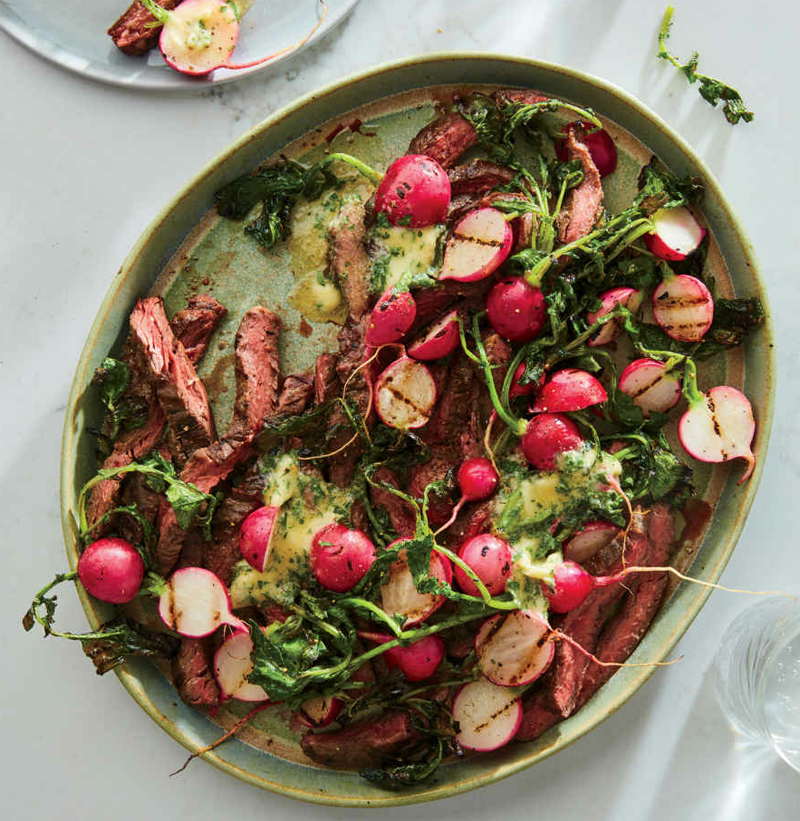 - Slice the steak against the grain. Arrange on a serving platter with the radishes. Serve the steak and radishes warm, with the mustard butter spooned over the top.