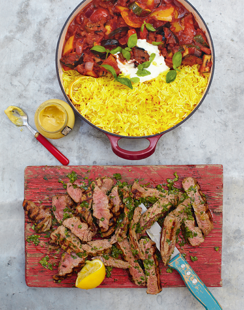 - On a board, finely slice the parsley stalks and roughly chop the leaves. Add the mustard and extra virgin olive oil, season with salt and pepper and squeeze over the lemon juice, then mix together and spread over the board. When the steaks are done, transfer them to the board, turn in the dressing, then slice. Tear the top leafy half of the basil into the ratatouille, season to taste, and serve with yoghurt and saffron rice.