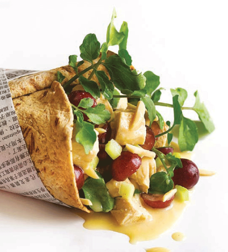 This is a fantastic way to use up cooked leftover chicken and makes a light lunch. The dressing is made with yogurt instead of the usual mayonnaise, but still tastes luscious and creamy. You’ll love the crunchy almond slivers, fresh celery, bursty grapes in this salad wrap.