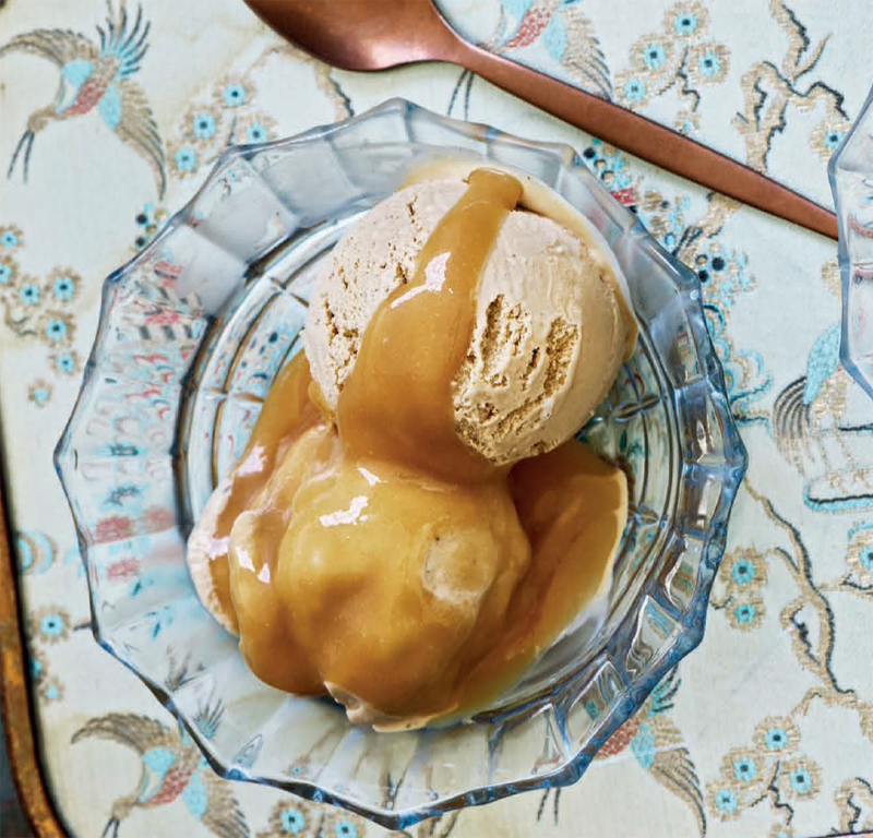 - Remove the ice cream from the freezer 5-10 minutes before serving. In the meantime, reheat the sweet white miso caramel sauce. Serve the hojicha ice cream with a generous drizzle of warm sauce.