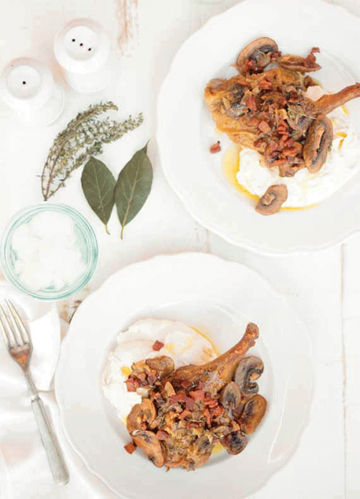 - Add the onions and leek to the pot and cook for 3 minutes. Meanwhile, tie the bay leaves, rosemary, and thyme together with kitchen twine. Add the bouquet of herbs and the broth to the pot. Return the duck legs to the pot, bring to a simmer, cover, and simmer for 75 minutes or until the duck is very tender. Remove the duck legs and set aside. Continue to cook the sauce until reduced and thickened to your liking, then return the duck to the sauce. Meanwhile, Make the Bacon and Mushrooms