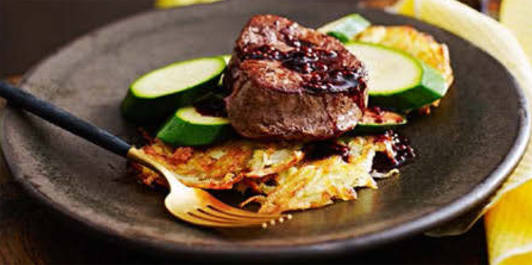 - Divide rosti and steamed zucchini between serving plates. Top with beef. Spoon sauce over beef and serve.