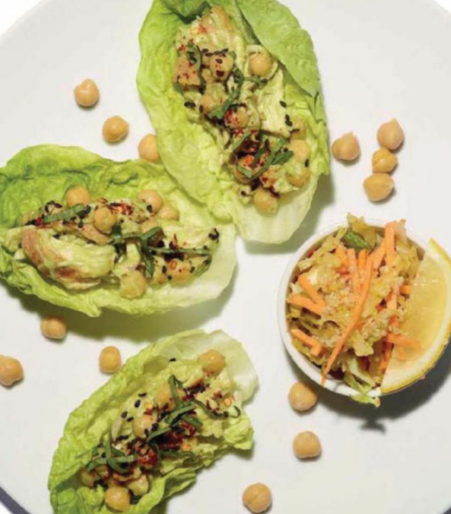 - Add avo mixture to the chicken, along with chickpeas, basil, spring onion and a pinch of salt and pepper. Stir to combine.