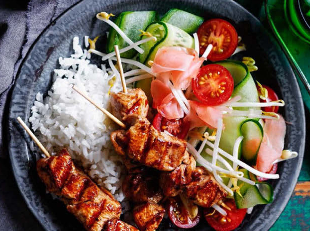- Put cucumber, tomato, sprouts and ginger in a bowl. Toss to combine. Arrange salad on a serving plate. Add rice and skewers, and serve.