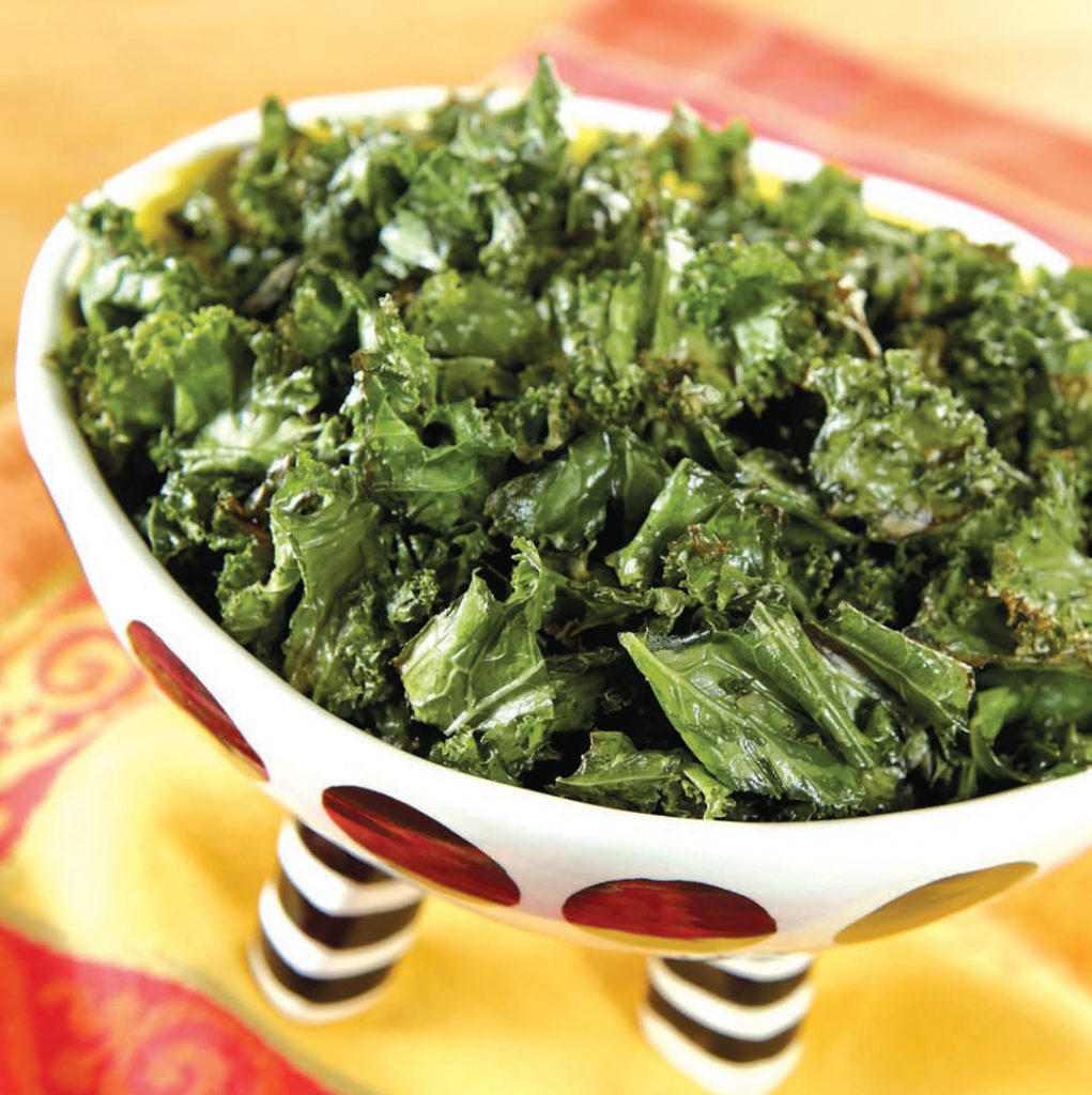 - Spread kale strips evenly across a large baking sheet. Transfer to preheated oven and bake until crispy, about 5 minutes. To prevent strips from burning, toss once or twice during baking.