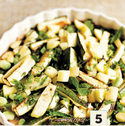 Meanwhile, preheat the grill to high. Place the courgettes on a baking sheet and spray with cooking spray to coat, then cook under the preheated grill until slightly charred and soft, turning halfway through. Steam the broad beans until just tender. Combine the eggs, milk, cheese, mint, nutmeg, and salt and pepper to taste in a bowl.- Preheat the oven to 190°C/375°F/Gas Mark 5. Remove the pastry from the refrigerator and roll out on a lightly floured surface into a rough round, then cut out a neat round using a 20-cm/8-inch flan dish as a guide.