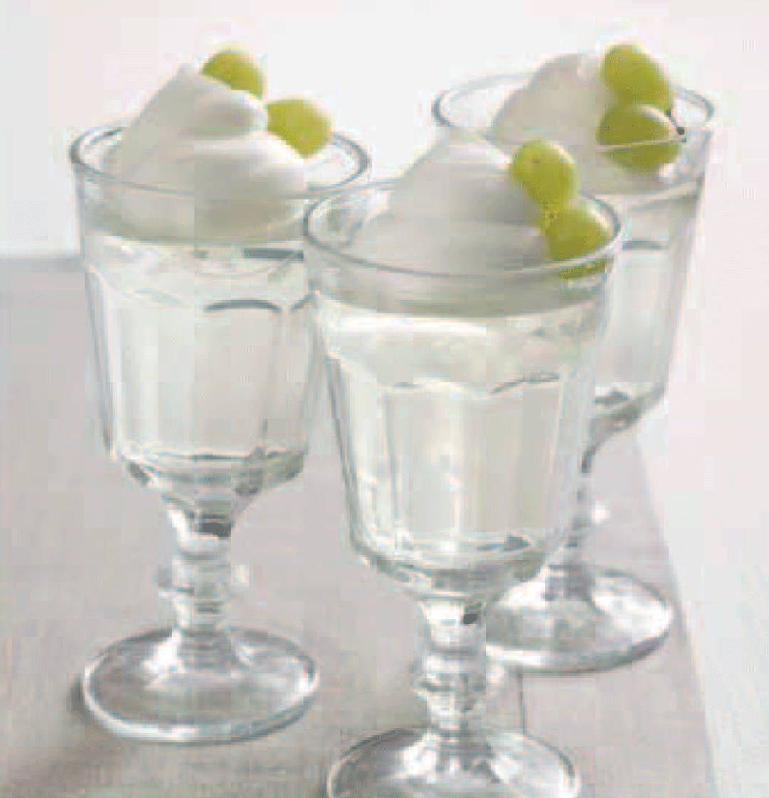 - Stir 2 cups tepid water, the liqueur, and the dissolved gelatin together in a large measuring cup until combined. Divide among four 8 oz (240 ml) dessert glasses. Refrigerate at least 3 hours, until set. Top each with whipped cream and some grapes, and serve chilled.