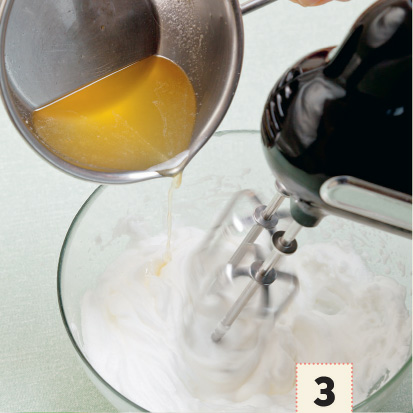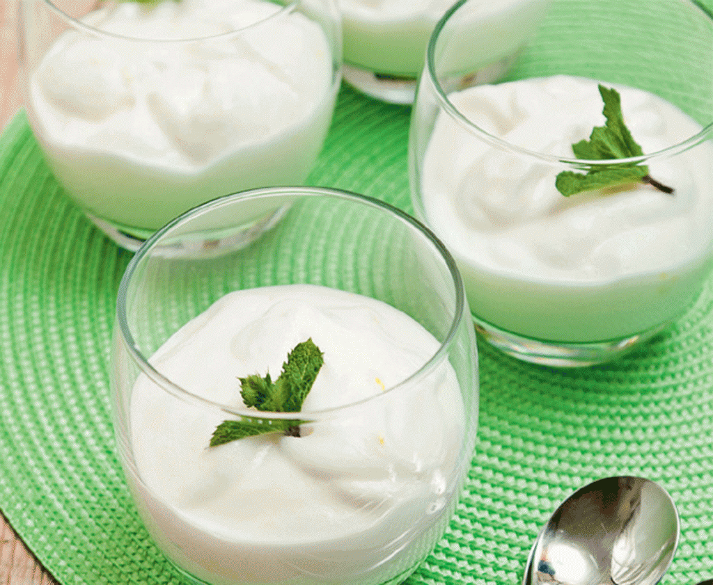 Remove the mint sprig from the syrup. Add the lemon rind to the syrup, then gradually drizzle the syrup into the beaten egg whites, whisking at high speed. Add the yogurt to the egg white mixture and fold in lightly with a large metal spoon.