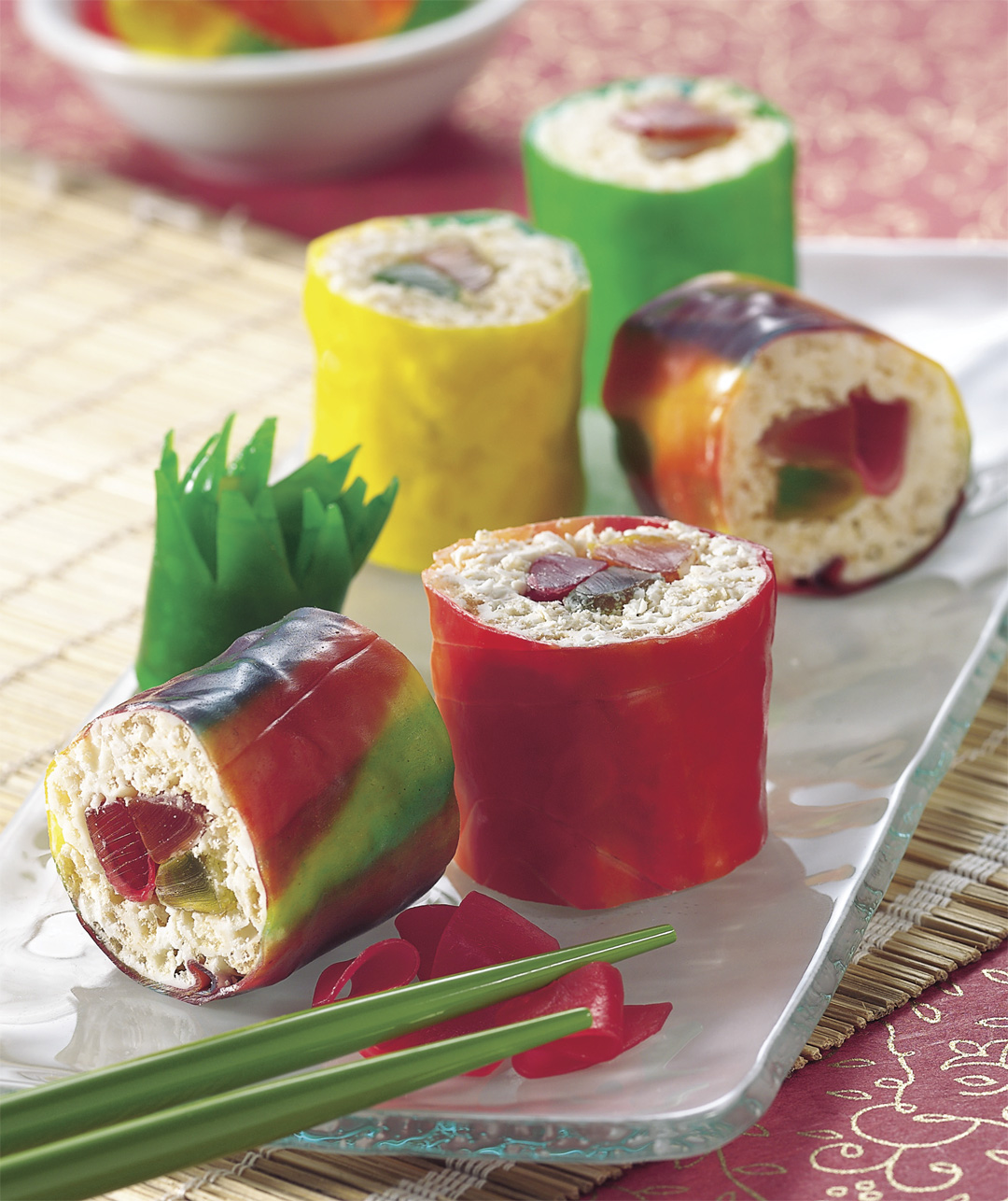 - Unroll fruit snack rolls. For each sushi roll, spread ¼ of cereal mixture on snack roll to within½ inch of one short side. Arrange 3 candy worms, side by side, on cereal-covered short side.