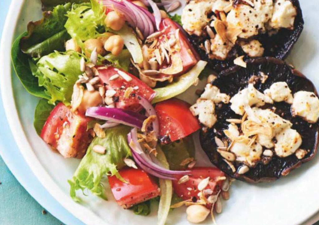 - Divide the salad leaves, onion, tomatoes and chickpeas among 4 plates. Put 2 mushrooms on each plate, then scatter with the seeds and drizzle over the dressing to serve.