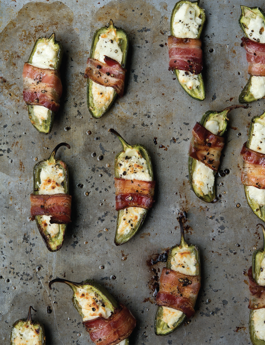 - Spoon cream cheese into each jalapeño half. Wrap each piece with a half bacon slice. Place on a rimmed baking sheet and bake for about 20 minutes until the bacon is cooked through but not yet completely crispy.