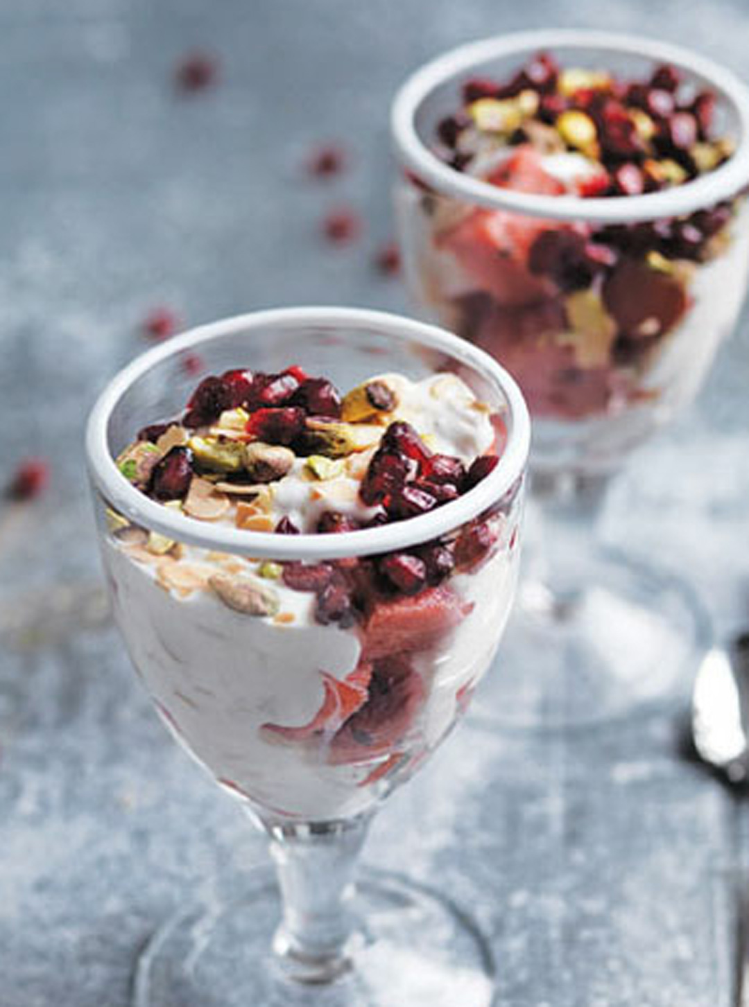 Divide the watermelon chunks between four serving glasses and spoon a quarter of the yogurt mixture over the top of each.- Sprinkle with the remaining nuts, followed by the pomegranate seeds, and serve the sundaes immediately.