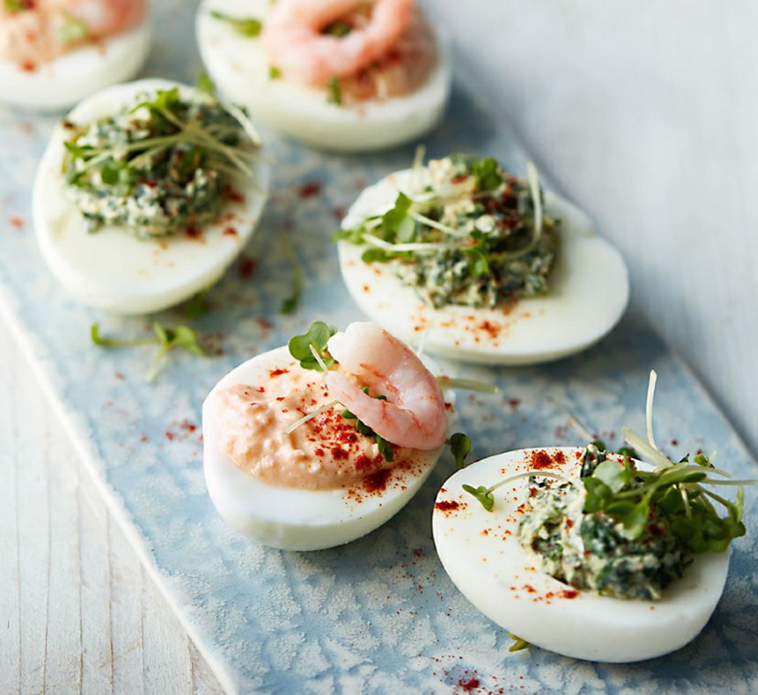 - Garnish with a sprinkling of paprika and cress. Top each of the prawn-filled eggs with a prawn.