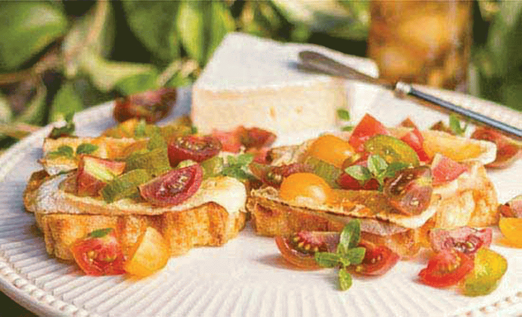 - Grease the bread on both sides with the butter and top each slice with several slices of brie. Place the prepared bread on a rimmed baking sheet and place on the middle rack in the oven to broil for about 2 minutes, until the cheese is bubbling and slightly browned.