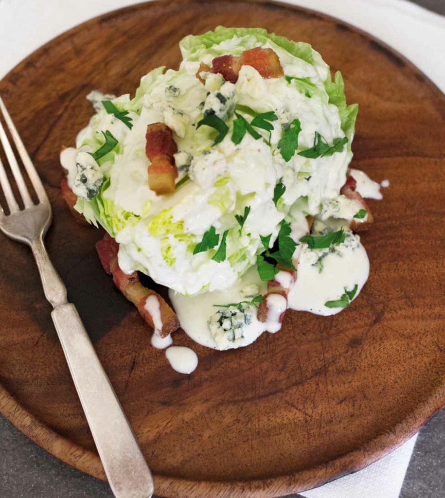 Crisp iceberg lettuce wedges are coated with a tangy blue cheese dressing and sprinkled with crunchy bacon pieces.