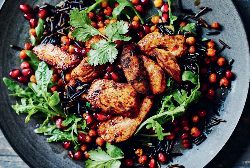 - Divide the rocket between two plates, top with the rice and chickpea mixture, then top with the cooked chicken. Scatter over the pomegranate seeds and coriander, pour over the dressing and serve.