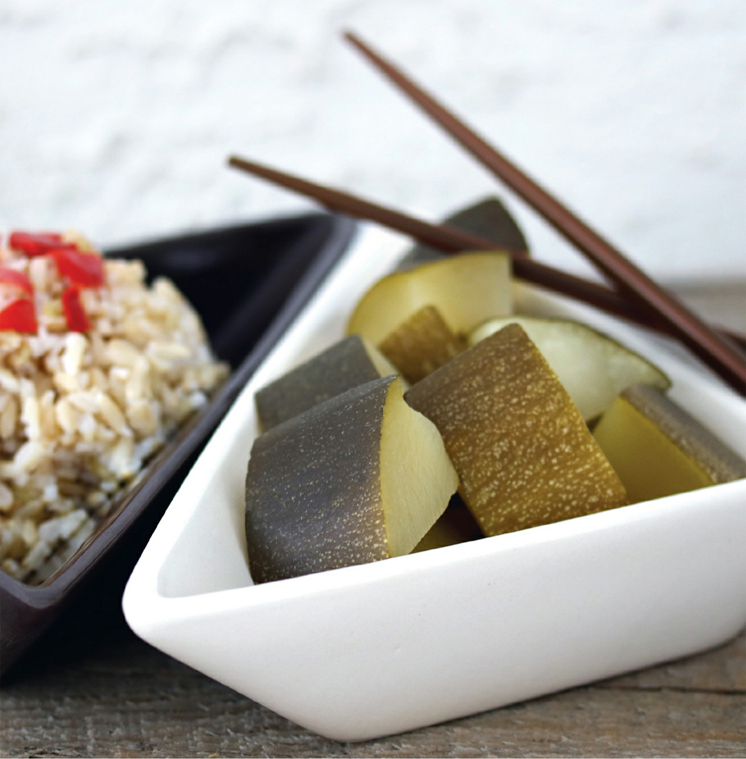 - Combine the coriander, chili, cloves, anise, mustard, turmeric, and pepper in a small to medium crock. Add the zucchini and stir to combine. Weigh down the zucchini with clean, food-safe weights or a jar or bowl of water.
