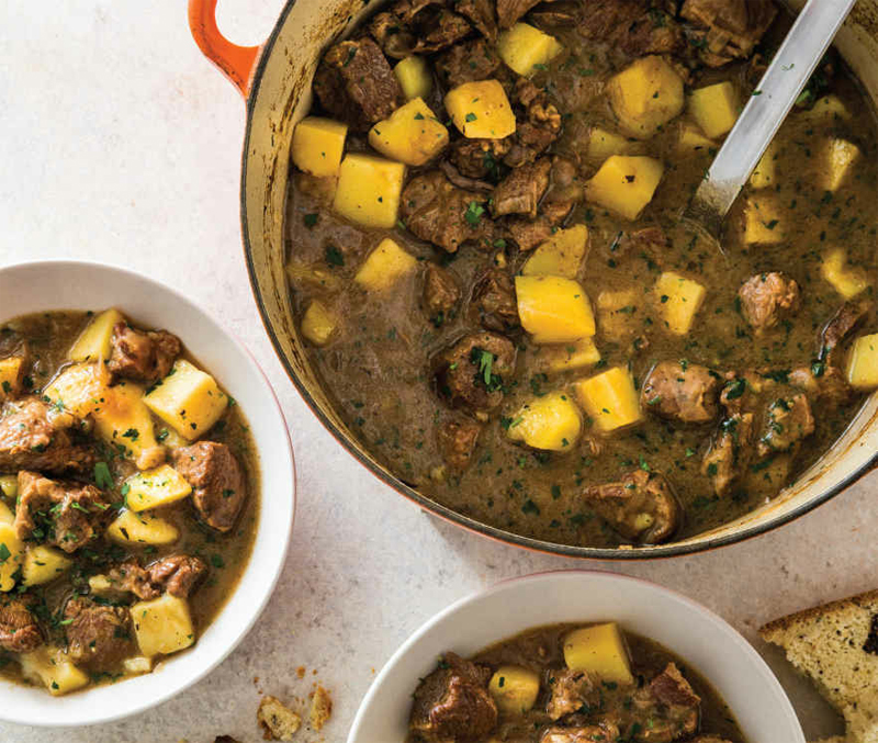 - Remove pot from oven and discard bones. Stir potatoes into stew and let sit for 5 minutes. Skim excess fat from surface of stew using wide, shallow spoon. Adjust consistency with extra hot water as needed. Stir in parsley and season with salt and pepper to taste. Serve.