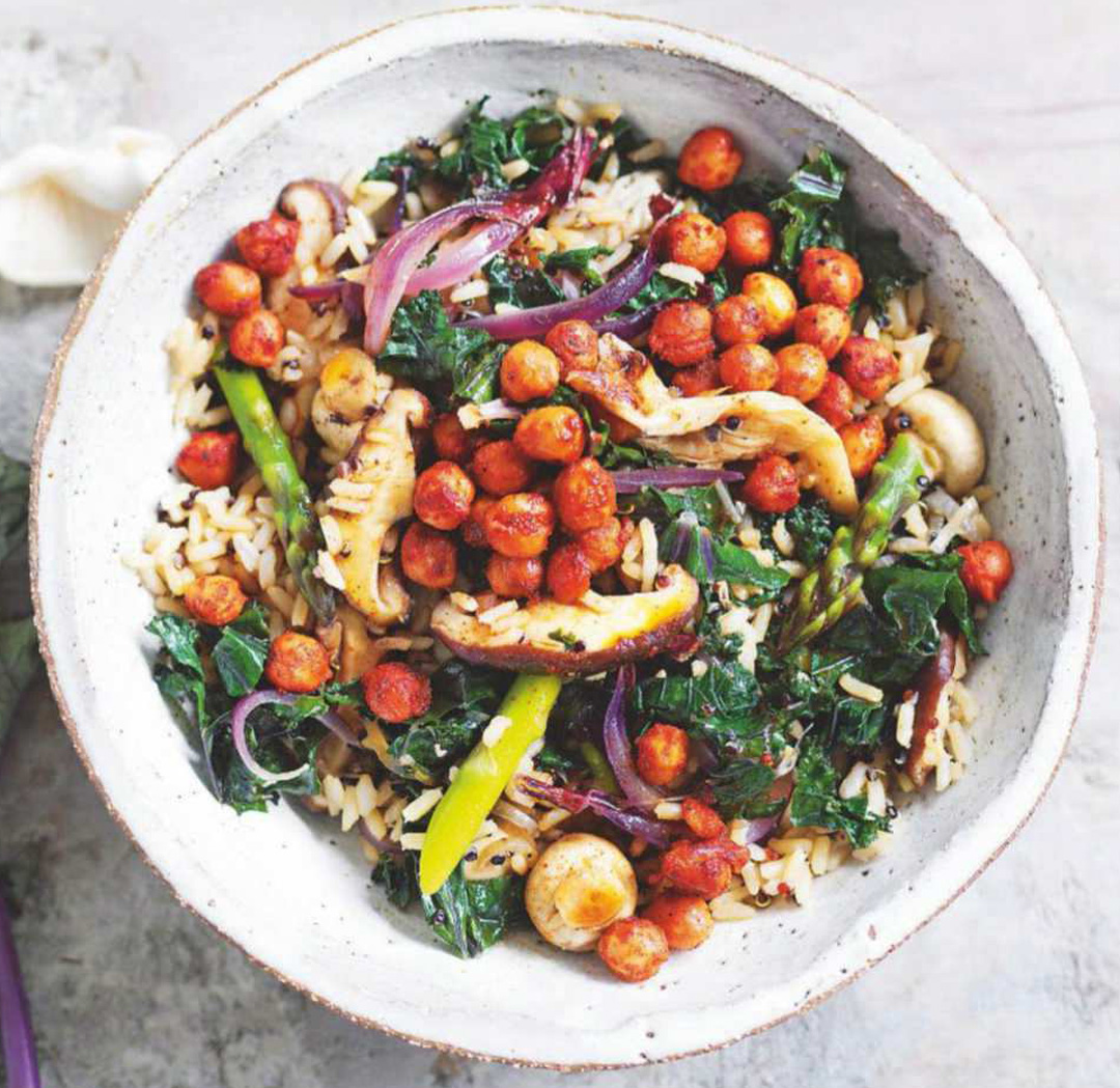 - Heat the rice and quinoa according to the pack instructions, then divide between 2 serving bowls. Add the kale and mushroom mixture, then top with the chickpeas and drizzle with the dressing.