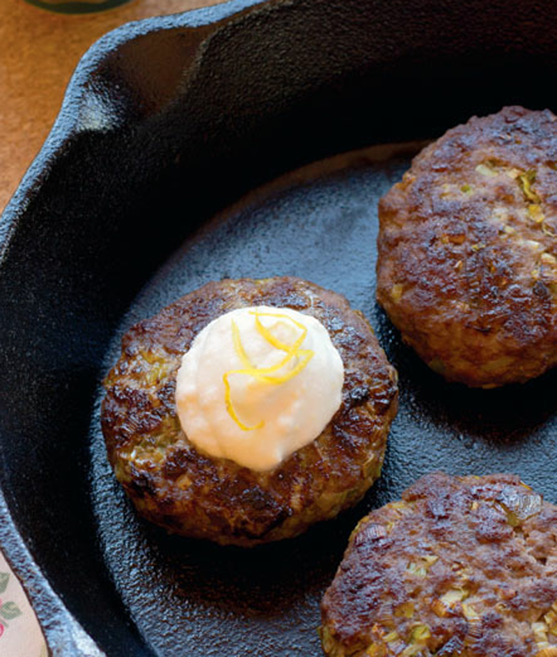 - Add the remaining oil to a skillet. Over medium heat, add the patties and cook each side until browned, about 5 minutes per side, making sure the lamb is cooked all the way through. Rest the burgers while you make the lemon cream.