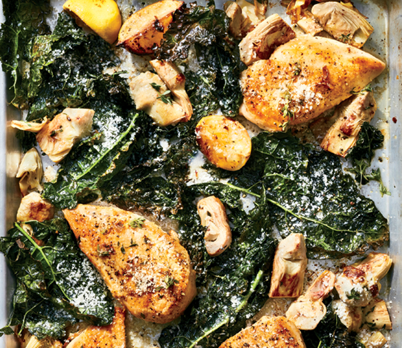 - Sprinkle chicken with black pepper and salt. Carefully remove pan from oven. Add 1 tablespoon oil to pan; tilt pan to coat. Add chicken to pan; broil 5 minutes. Add artichokes and lemon quarters to pan. Drizzle with remaining 1 tablespoon oil, and sprinkle with 1½ teaspoons thyme. Broil until chicken is done, 10 to 12 minutes. Place chicken on a cutting board. Add kale mixture to the pan, and broil until kale is frizzled and edges are crisp, 3 to 5 minutes.
