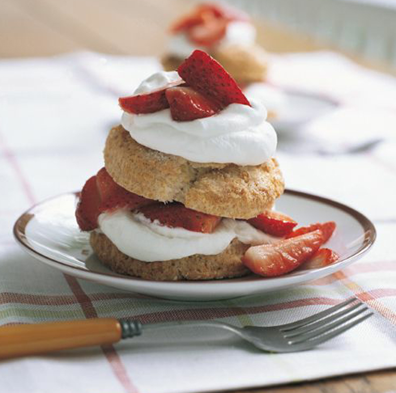 - To assemble the shortcake: Split each biscuit in half with a fork, as you would an English muffin. Place the bottoms of the biscuits on dessert plates. Top each biscuit with some of the whipped cream and 2 generous tablespoons of the strawberry mixture (including the juices). Cover with the top half of the biscuit. Dollop generously with the remaining whipped cream, then divide the remaining strawberries among the biscuits. Serve immediately.