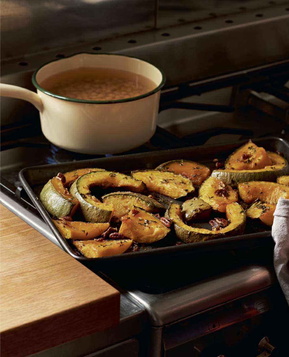 This is best with winter squash or pumpkin such as kabocha (delica), acorn and red kuri (onion) squash, whose nutty, earthy flavours suit the maple and pecan well. The more ubiquitous butternut verges on being too sweet to be matched with maple (for my palate anyway), but do use it if you can’t find the others.