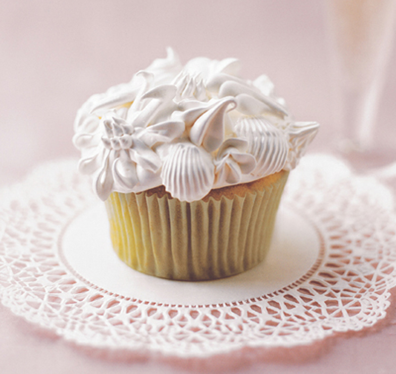 Any bride would blush to behold such fanciful cupcakes on her special day. Bakers, too, will relish making the exquisite meringue “flowers,” which are first piped onto parchment-lined baking sheets, then baked until firm and dry. Their crisp, delicate texture makes them a delight to eat.