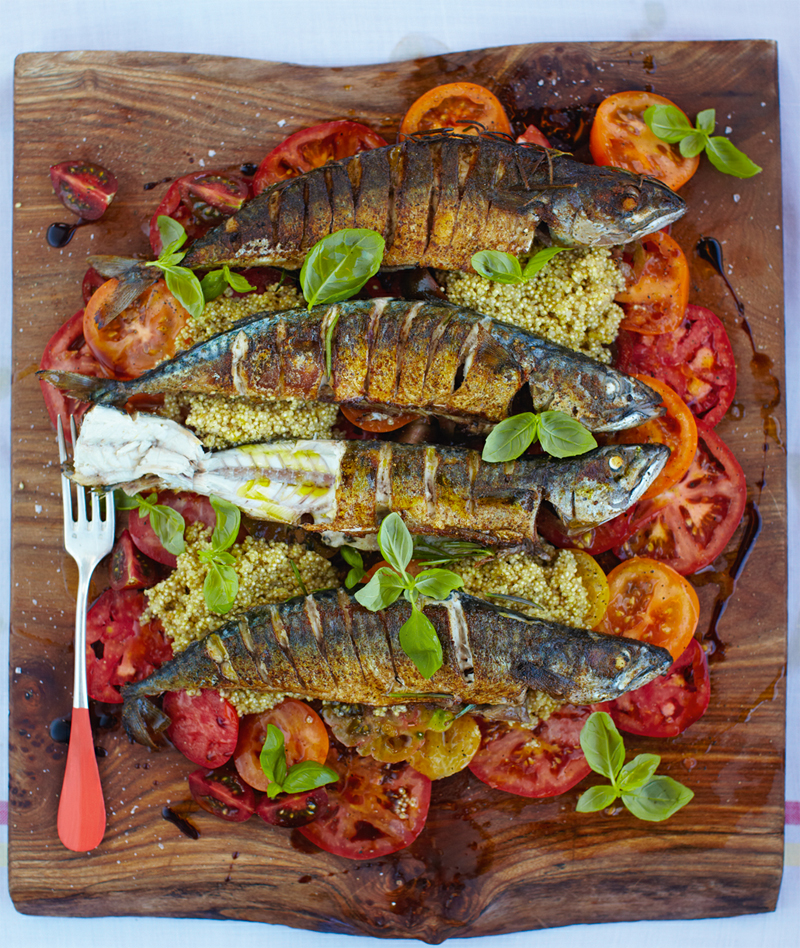 - When the quinoa is cooked (after roughly 10 minutes), drain it and use tongs to squeeze over the lemon juice, then spoon the quinoa into the centre of the tomatoes. Drizzle with the extra virgin olive oil and balsamic, and a pinch of salt and pepper. Lay the crispy fish on top. Mix the yoghurt and horseradish together and dollop it over the fish. Pick over the basil leaves and serve.