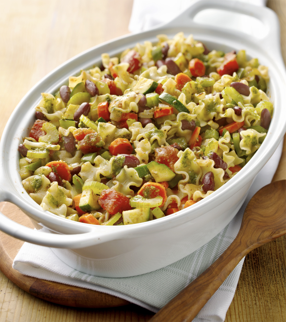 - Place noodles in ungreased 2½-quart casserole. Stir in carrot mixture, beans, tomatoes, ¼ cup of the cheese, salt, pepper and pesto.