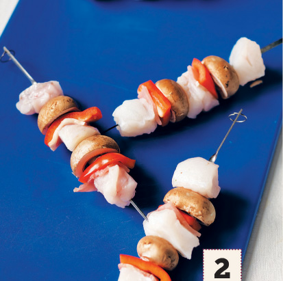 Meanwhile, cut any large mushrooms in half. Thread the fish, mushrooms, red pepper and bacon evenly onto four metal skewers.- Preheat the grill and brush the kebabs with the oil. Place the kebabs on a rack under the preheated grill and cook for about 4 minutes on each side, or until the fish and bacon are cooked through and the vegetables are tender.