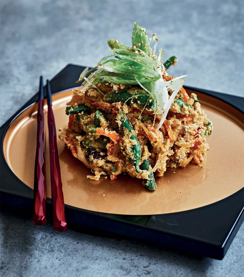 Okara is the soybean lees leftover from making soy milk and in Japan it is used in a number of dishes including unohana. An okara stir-fry served as a side dish, unohana is rich in protein and fibre, and is full of flavour with the texture of fine couscous.