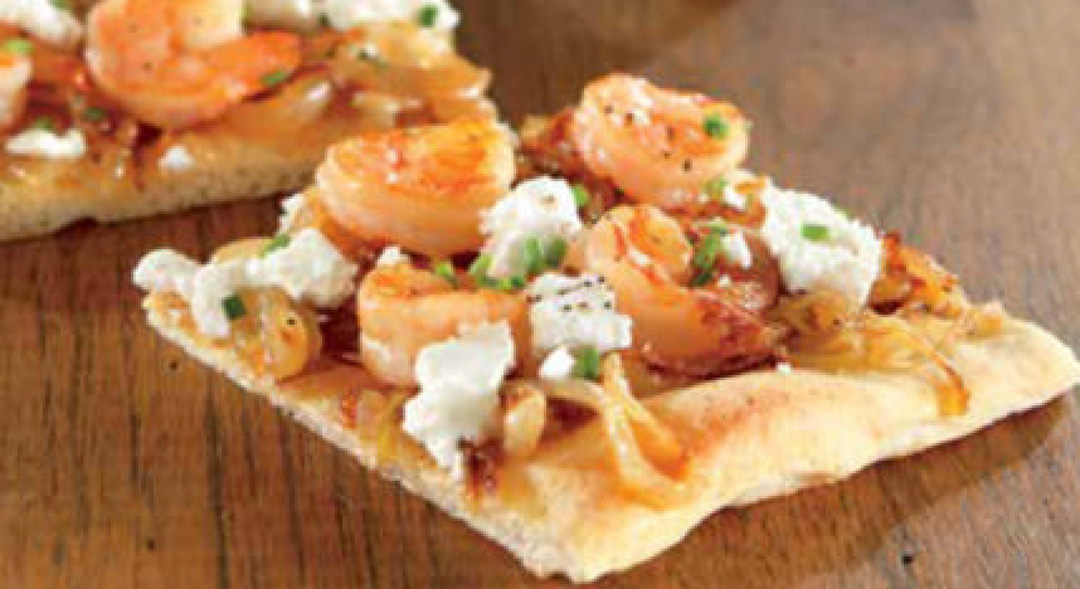 - Heat remaining 2 teaspoons oil in same skillet over medium heat. Cook and stir shrimp 2 minutes or until pink and opaque. Arrange shrimp over onions on pizza. Sprinkle with chives, goat cheese and pepper, if desired.