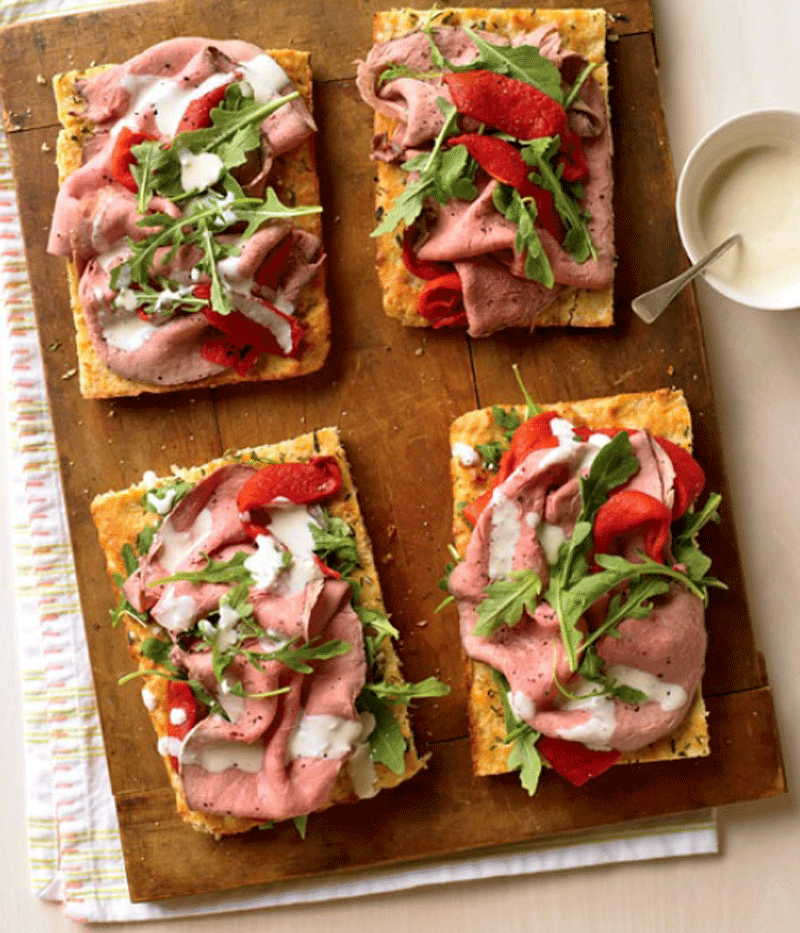 - On each of 4 lunch plates, place 1 slice of focaccia. Evenly divide the arugula, peppers, and steak or roast beef among the focaccia. Drizzle with the horseradish sauce.